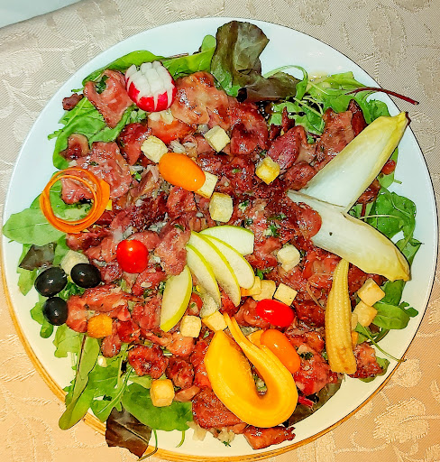 On y est très bien accueulli. Le service ce soir là, était dans les mains d'un jeune homme très efficace. À lui seul il a géré une salle pleine (soit une 40aine de couverts) avec rapidité gentillesse et avec l'œil du professionnel sur toute la salle. Chapeau. La nourriture qu'on sert à l'auberge est généreuse et traditionnelle. Viandes et vins de qualité et une cuisine dans laquelle on sent le chef impliqué. Une grande sélection de vins locaux et de bons vins à des prix raisonnables. En résumé une soirée à 3 très agréable un repas delicieux(ma souris d'agneau était fondante à souhaits) et un très bon moment. Le décor est très '' personnel'' mais je reviendrai avec plaisir avec la certitude de retrouver une soirée réussie au restaurant. Une facture à 3 avec une bouteille de rouge local pour 100 euro. C'est raisonnable et rien à dire le service autant que les plats étaient délicieux. Merci pour le pâté de lapin servi gracieusement pour nous faire patienter. Je recommande l'auberge des grands vins...