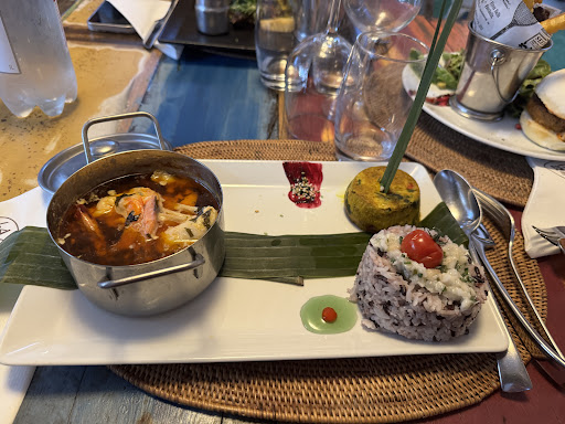Read moreDes amis nous avaient conseillé ce restaurant pour le cadre et la nourriture soit disant originale et savoureuse. Nous n’avons pas du tout aimé. Nous avons goûté 2 assiettes de tapas différentes à l’apéritif (entre 20 et 25€ chacune), assez insipides . Nous avons ensuite pris des plats entre 28 et 31€, les intitulés avaient l’air intéressants et la presentation assez originale, même si en y regardant de plus près, la vaisselle était tantôt ébréchée, tantôt pas nette La parillada de 3 viandes exotiques (zèbre, kangourou, bœuf argentin) était sans goût, cuisson mal maîtrisée, le gratin de pommes de terre aux champignons qui l’accompagnait avait un goût de fromage fort, comme s’il avait tourné. La cassolette de Sole, St Jacques et crevette à la thaï soit disant épicée n’avait aucun goût, le tout flottait dans un liquide surmonté de gras (genre eau de vaisselle de la veille) Le burger était plutôt bon mais la salade et les frites qui l’accompagnaient immangeables C’est une honte de proposer des plats à ce tarif pour cette qualité Le cadre est original mais regardez le en passant devant, ça suffit largement, car en regardant de plus près, tout est mal entretenu, la terrasse en bois mériterait un coup de karcher pour enlever le vert de l’hiver dernier, les araignées et leurs toiles sont au paradis dans les toilettes. Quand en réglant la note, la patronne m’a demandé si tout s’était bien passé , je lui ai répondu que non nous avions été déçus par les goûts, elle m’a regardé de haut d’un air surpris, comme si j’étais la première à ne pas trouver ça bon… Je lui ai dit, c’est pas grave ça arrive ce n’était pas à notre goût… Mais en rentrant, nous avions tous mal au ventre suite à ce repas trop lourd et sans saveur alors j’ai regardé les avis et j’ai découvert que nous n’étions pas les premiers à penser ça !!! Dommage que je n’ai pas regardé les avis avant...