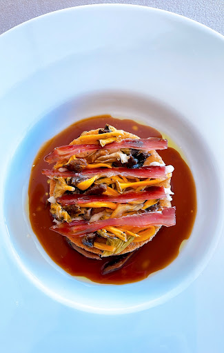 Bacon strips lining up across a bed of mushrooms on a wafer disc. Like plowed fields on a farm. Beneath that, Guinea fowl stew a perfect harmony of umami.