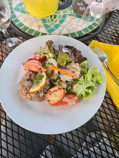 Nice restaurant right on the wide river. Very precise opening hours. Very French, not surprising really! Watched surfers coming down the water on a small tsunami which we were told happens regularly. Ate whole tiny white prawns which are a speciality and an acquired taste. I haven’t acquired it yet. Lots of moules and fish on the menu. Lovely location. Great to watch the...