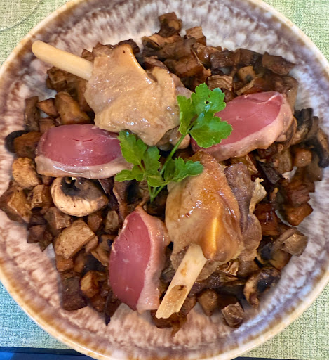 Delicious lunch for two. My husband enjoyed a beautifully composed entree potato salad with ham and the plate of the day of trio of steak, magret, and sausage. My entree salad with blood sausage accent was delicious. I had an amazing dish of braised duck sleeve (a yummy duck leg), smoked duck breast over a roasted medley of potatoes...