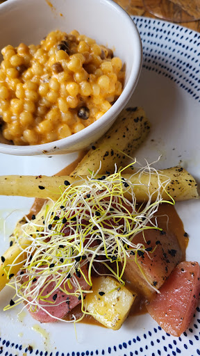 La carte change au grès des envies du chef alors inutile de se lancer dans un descriptif sans bornes de ce qu'il y avait dans l'assiette, vous ne le retrouverez certainement pas à la carte et c'est tant pis pour vous ! Les absents ont toujours tort. C'était parfait. C'est frais, c'est simple, et c'est bon. Triptyque gagnant, paroxysme du plaisir gustatif.