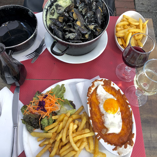 Nous sommes venus pour la braderie de Lille et nous aurions mieux fait de rester le ventre vide. Commençons par le service, on nous installe à une table sale et juste débarrassée. On nous prend notre commande et on nous sert les boissons dans des gobelets en plastique. Je demande à une serveuse de nous nettoyer la table, elle revient avec un simple torchon à peine humide et à juste étaler la crasse, aucun produit, rien ! On vient ensuite nous importuner 3 fois avec les mauvais plats. On nous sert ensuite uniquement la salade César de ma compagne, sans mon plat. Salade César degarni, avec 3 petits morceaux de poulets et quelques copeaux de parmesan. 5 minutes après, on me sert mes moules à la crème dans un plat en plastique, sans rien pour mettre mes coquilles vides. Que dire de ces moules ? Les plus mauvaises que je n'ai jamais mangé. 1/3 étaient fermées, l'autre tiers étaient cassées avec les coquilles qui flotté dans le peu de sauce qu'il y'avait. Et l'autre tout juste mangeable avec certaines avec un goût abominable, probablement fermées mais cassés, et donc immangeable sauf si vous voulez chopper la tourista. Je demande du pain, qu'on me sert dans la minute, un pain industriel et sans goût, moins bon que dans une cantine d'école où le repas est à 3.50 euros. Qu'on me reprend à peine 3 minutes à près pour la demande d'une table à proximité. On ne parle pas du serveur qui a notre table voisine taxe des chewing gum aux clients. Je m'éclipse aux toilettes pour me rincer la bouche et les mains de cet abominie (Pas de rince doigt), et lorsque je reviens, sans qu'on est demandé l'addition, on réclame 85 euros et puis ensuite 43 euros pour une addition d'à peine plus de 35 euros à ma compagne, qu'elle a fini par régler à cause de l'insistance du serveur. J'ai donc été expliqué ma mauvaise expérience au responsable, à peine étonné mais compréhensif qui nous a remboursé la totalité de l'addition, d'où ma seconde étoile. Dommage, j'aurai aimé règler l'addition mais passer un bon moment, ou du moins correct sans avoir mal au ventre durant toute cette belle journée de braderie dans cette si jolie ville...