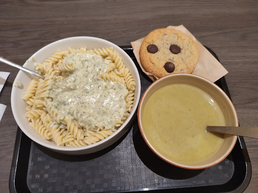 Read moreAccueil sympa même si le tutoiement direct m'a un peu étonné et le service est rapide malgré l'affluence . Les prix correspondent aux tarifs moyens du secteur mais j'ai trouvé mon sandwich poulet un peu léger pour tenir l'après midi (pour info je suis un gaillard de 95kg). La soupe était très bonne et le dessert correct. Pour conclure, manger sur place n'est visiblement pas le point fort, il y a peu d'espace et lieu n'est pas spécialement agréable. De plus pas mal de choses qui traînent jusqu'au couloir des toilettes (cartons...