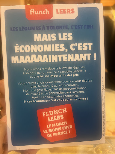 AprĂšs avoir vu les panneaux publicitaires vantant les prix baissĂ©s au Flunch de Leers, nous nous y sommes rendus en famille Ă 13h pour dĂ©jeuner. Quelle premiĂšre dĂ©ception ! Changement de concept, il n y a plus de lĂ©gumes Ă volontĂ©. Vous ne faites qu un seul passage dans une petite assiette et c est quelqu un qui vous sert ( grande perte de temps et lenteur). Bien sĂ»r, cela on ne vous le dit pas sur les belles affiches. On poste une personne Ă l entrĂ©e pour le dire oralement seulement. Au niveau des prix, tout est confus, rien Ă voir avec les plats habituels. C est cher et insipide. Nous prenons un menu, pour ma.part,.un petit morceau de colin pour 11euros 50, pas de possibilitĂ© de prendre au verre Ă la fontaine car les deux Fontaines sont cassĂ©es. Si vous prenez un coca, comptez donc encore + 0,70 centimes de supplĂ©ments malgrĂ© le fait qu il fasse soit disant partie du menu. Attendant mon tour devant les plats chauds, je remarque quelques moules dans un plat. Je demande alors si les moules sont disponibles autrement que le soir. Le serveur me rĂ©pond euh enfin oui on en a mais on ne les affiche pas. đ€ Ajoutez Ă cela des lĂ©gumes froids, tiĂšdes, sans saveur. Un personnel qui semble avoir perdu la motivation et un responsable qui reste sourd Ă nos retours puisqu apparemment il tente une expĂ©rience sur trois mois. Quand on tente une telle experience, il me semble qu on reste ouverts aux retours des clients, ce que nous avons voulu faire dans une volontĂ© d amĂ©liorer les choses et de faire une critique constructive mais il n y a aucune boĂźte Ă suggestion et lorsque je veux exprimer notre dĂ©ception au responsable, il a toujours un argument pour justifier les manquements de son pseudo restaurant, tout en restant convaincu que tout va bien. Enfin, Ă 13h, le Flunch Ă©tait aux 3/4 vide, les personnes attendant leurs lĂ©gumes comme moi Ă©taient totalement dĂ©goĂ»tĂ©es.