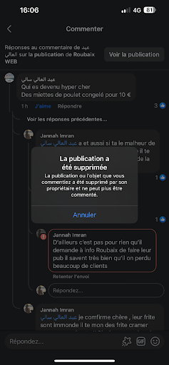A la fin c'est la meuf irrespectueuse qui me donne la commande, j'arrive chez moi, il manque les sauces, je prends mon tĂ©lĂ©phone j'appelle sans rĂ©ponse, je me suis dĂ©placĂ©e, j'arrive et je l'a voit, et elle m'a regardĂ© d'un air bizarre comme si elle me disait tu fais quoi ici casse toi, je lui ai dit vous avez oubliĂ© les sauces, elle me dit quelle sauce, bah j'ai rĂ©cupĂ©rĂ© ma commande il y a Ă peine 5min vous les avez oublier, dĂ©jĂ elle s'excuse mĂȘme pas de plus je lui dit merci elle tourne sa tĂȘte vers ses collĂšgues comme si j'Ă©tais une voleuse alors que c'est elle la voleuse et irresponsable.