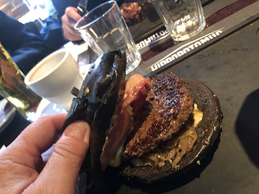A group of 12 of us descended upon this place early evening on Wednesday 8th May. They checked they could accommodate us and initially seated us at two 6 seater tables towards the back but as soon as a 12 seater became available they moved us. The orders were taken, complimentary crisps provided and we settled in. Our drinks arrived promptly and the food arrived, pretty much all at the same time about 10 minutes later. I went for the Steakhouse Burger in a black bread bun as the picture shows. They cobbled up a vegan burger for a friend and another had a burger in a brioche bun. One person had the fish. The rest went for various steaks. My burger was very nice, essentially a cheese and bacon burger. The other burgersxand fish went down well.