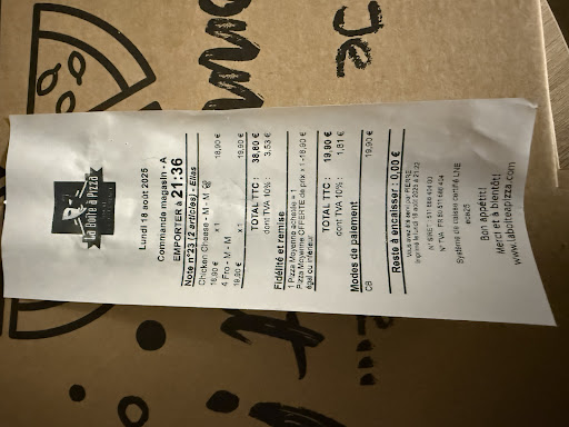 Read moreVenu manger Dimanche soir à emporter, Personnel sympathique, respectueux, endroit propre, j’encourage et j’apprécie . En soit la pâte fine n’est pas mauvaise, elle est croustillante mais les ingrédients manque cruellement de saveurs/assaisonnements, En effet je n’ai malheureusement pas eu la sensation de me régaler, tout était très fade même le goût de la base sauce tomate était totalement imperceptible Impression de manger une pâte à pizza sans rien dessus. Par ailleurs nous avons pris aussi 2 pizzas pâte moelleuse et là ..... Carnage ! En plus du manque de goût, la pâte dite « moelleuse » n’était pas cuite, presque crue donc immangeable et indigeste à la consommation. Total de 35 euros pour une qualité plus que médiocre c’est excessif...