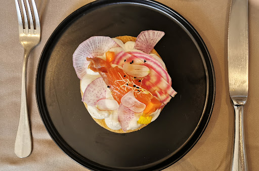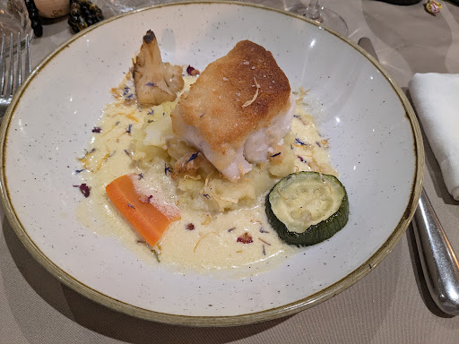 Arrivés sur le parking il ne restait qu'une place donc on se dit:il y a du monde Que nenni Avec nous,3 tables : 8 personnes Menu à un prix correct: Entrée : velouté de choux-fleur avec oeuf parfait, résultat l'œuf était froid,non coulant La serveuse avait dit l'inverse Plat: Beau morceau d'églefin avec un risotto de perles de pâtes et légumes de saison Poisson très bon,pâtes n'avaient rien d'un risotto, légumes bons Plat fade,pas assez relevé Dessert: Galette à la pomme : présentation 0 Galette posée dans l'assiette telle que avec une boule de glace dessus, sans décoration, sans petite crème accompagnatrice De plus quand vous entendez le personnel rigoler,s'amuser Ça ne se fait pas Puis une personne de la cuisine qui a fini son service et traverse le restaurant avec sa trottinette Je suis déçue car le cadre est très beau A part le manque de détecteur lumineux...
