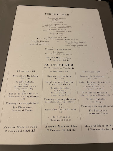 Read moreJ’aime bien commenter ce que je mange, mais pour la laiterie, je pense que c’est en dehors de mes capacités. Je vais néanmoins relever ce qui est marquant pour moi. l’huître, C’était exceptionnelle. Le pâté un peu tiède change complètement l’approche de cet aliment. L’acidité très équilibrée. Les œufs apportent une explosion en bouche. La combinaison est parfaite Le saint Jacques de Boulogne, je n’ai pas aimé. C’est la que cela va au delà de mes capacités, je ne sais pas dire pourquoi. La julienne de truffe avait un parfum très faible. Le chef avait bien préciser que ce serait subtil, car tout est naturel sans arôme ajouté. J’étais néanmoins un peu déçue, car j’ai un souvenir de truffe noire très parfumée râpées au dessus de mes pâtes en Italie. Genièvre de houle, c’est ce que j’ai le plus aimé. Le parfum de géranium très agréable, bien équilibré dans la touche de salé. jai pas aimé l’oursin, il était un peu élastique, pour moi cela devrait donc fondre dans la bouche. Le thé menthe était dans une eau tiède, je les aime très chauds les thés. L’assiette de fromage, mon mari très calé en fromage, trouve que la présentation qu’on lui a donné ne correspond pas à ce qu’il a mangé. L’omelette aux truffes flambée au whisky par le chef en personne ! Top !( cad sans l’odeur cramée de la table derrière nous)