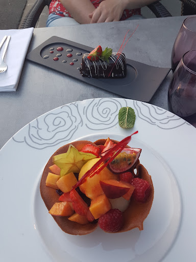 Nouvelle decouverte pour le repas de mes 25 ans de mariage et budget de 70 € par personne. Habitué des gastros et attiré par les avis, la carte découverte sur place s'avère tourner en rond avec des entrées et des plats aux consonances rêveuses mais très pauvres en originalité au finale dans l'assiette. Un pavé rossinni baignant dans la sauce où la tranche de foie gras le coiffant n'est qu'un copeau gluant ; une salade gambas façon césar construite en fait sur une base en cercle de 8cm d'épaisseur de salade, surmontée de deux tomates cerise, 4 copeaux de parmesan et 6 ridicules petites gambas trop cuites et granuleuses en bouche. Pour ma femme, un carpacio de saint jacques réalisé avec.... une noix ( pas possible autrement) et quelques fruits rouges puis un turbo trop cuit à la sauce hollandaise fade et sans cœur. Alors pour 20 euros l'entrée et le plat 30 à 34 €, je n'ai rien eu d'extraordinaire, pire raté en cuisson. Que dire des propositions d'accompagnement : purée truffe, purée nature, écrasé de pdt, pâte ou risotto ou une "portion ridicule de 4 brins de choux fleur et autres légumes ou...frites !!! C'est là brasserie là, pas un gastro !!! Sinon, nous étions contraints à l'obsession à l'association "viande et fruit" sans vraiment pouvoir y échapper (foie gras fruit rouge ou orange Monsieur, sinon, nature....20€.... pour une tranche nature ????? Confiture d'oignon au moins ??? Non nature ou fruit ou...rien !!!!!!) Bref arrivé au dessert, quand j'ai vu la tête de la tartelette ou du fraisier à 5 cm de diamètre pour 10 balles, nous avons conclu notre expérience, le ventre plein....de pain !!! Car question quantité, les frites (car en fait, vous finissait par avoir un pavé de bœuf, frites sauce foie gras), c'est un simple godet dont la moitié sont des chips trop cuites. Quand à l'ambiance, les parents qui laissent courir leurs mouflets dans les restos , et sans qu'aucun serveur ne fasse de remarque, ça craint, et je ne suis pas chez Mac Do. Bref, J'ai perdu 150 € que j'aurai pu mettre largement dans un étoilé michelin pour cette occasion avec un brin de classe et de...
