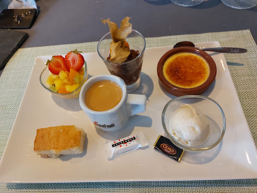Read morePoints positifs : emplacement, cadre, apéritif (americano maison). Beaucoup de points négatifs : nos plats sont servis alors que nous n'avons pas fini l'apéritif, nous avons pris un filet de truite aux légumes, raffiné mais pas assez chaud et quantité insuffisante. Carte des desserts : seulement 3 desserts proposés à la carte : nougat glacé, éclair au kit Kat et financier aux fruits + café gourmand. Du coup, ayant encore faim, j'ai pris l'assiette de fromage, quelle déception : un morceau de mimolette rouge, un morceau de camembert et un morceau de bûche de chèvre. Quelle déception, nous ne...