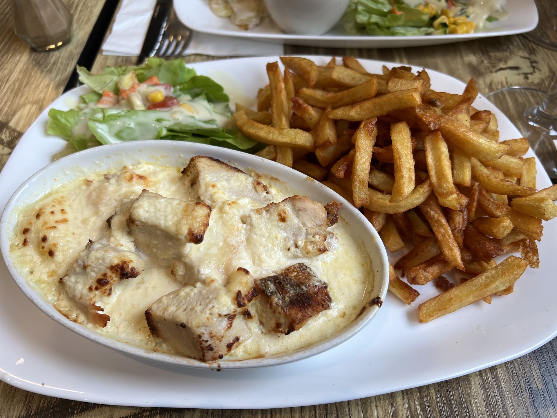 Passons au repas… après avoir commandé une carbonnade quelle surprise… des morceaux de bœuf baignaient dans une sauce marron liquide comme pas possible et sans goût!!! Le pain industriel ne remonte malheureusement pas la note… le chef devrait...