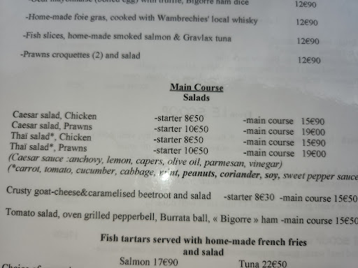 A pleasant outdoor seating area, we were looking for a light meal. They have several different types of tartars, based on seasoning. We wanted to try Thai. It was served with bits of green leaves, covered with crushed peanuts and was tangy and very good. Then we ordered what on the English menu is called “Crusty goat-cheese & caramelized beetroot” It was an interesting dish, a sort of an egg roll stuffed with beets and goat cheese. It was really crunchy, and the goat cheese was not very strong. Not sure that it would be my favorite dish, but it was worth trying. Salmon filet, served with lime risotto, was a bit overcooked, even though we asked for it to be pink. The shrimp bisque was basically the sauce for the fish. We also ordered a Caesar Salad, which was very unusual as well. Strips of grilled chicken on one side of the place, and bits of romaine lettuce, tomato and croutons on the other. Finished off with a couple of ice cream bowls, raspberry, coffee & rum raisin. The ice cream was very good. Overall a good meal, but not extraordinary in any way. I did notice that majority of the customers at neighboring tables were only getting tartars, which is the signature dish. The service was excellent. Our waiter was very courteous and...