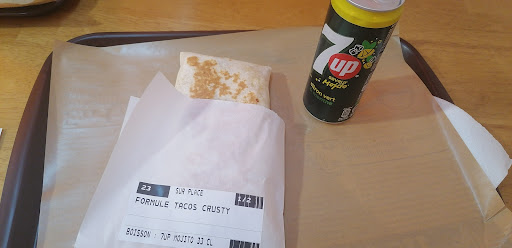Première visite et grosse déception... Le restaurant vide a cette heure aurait du nous mettre la puce a l'oreille. Je ne sais pas d'où vous tenez votre note de 4,6 mais cela est plus que trompeur. Le sol est collant, les tables également, nous devons manger en levitation sans rien toucher... Lol. Les balles de jeux en plastiques trainent a terre, nous pouvons marcher dessus et tomber, ou bien s'en prendre une en mangeant car il n'y a pas de filet dans l'espace de jeux pour les retenirs. En ce qui concerne la nourriture, vous ne vous foulez strictement pas du tout... Je me demande pourquoi le double tacos a la même taille que le simple cela n'est pas logique... Tacos rikiki et plat, rien avoir avec vos concurrents aux allentours Frite du tacos pas cuites, sauces sans goût... Ne vaut pas son prix, heureusement que l'ont avait un code de réduction de 50%... Et même avec le code cela ne vaut pas le prix Il y a beaucoup mieux et beaucoup plus goûtu...