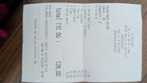 Read moreJ ai été très déçue par ce restaurant, l entrée, champignons,avec de la sauce froide, ensuite une dorade réellement pas cuite,j ai laissé dans min assiette, on m à confirme que le rose était la couleur normale de la cuisson de ce poisson , il n était pas cuit, puis que pas tendre, le dessert, du fromage, qui n à pas de goût, et pour ainsi dire, on ne voyait que la croûte, tellement c était fin et minuscule, quant au café je l ai trouvé imbuvable,,je ne recommande pas...