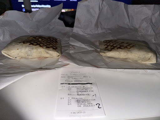 Non seulement il est impossible de passer commande via Uber Eats ou l’application, mais on se heurte également à des restrictions comme l’impossibilité d’ajouter plus de sauce fromagère. À la borne, le ticket chute systématiquement au sol, créant une gêne supplémentaire. Le point le plus frustrant fut l’absence de personnel à la caisse ; malgré l’attente pour être encaisser, aucune commande n’est préparée tant que le paiement n’est pas effectué. L’unique employé à l’accueil n’étant pas formé pour encaisser, il a fallu attendre qu’une personne en cuisine sorte pour s’en charger, allongeant le temps d’attente à 25 minutes avant même que la préparation des tacos commence, suivie de 25 minutes supplémentaires pour obtenir seulement deux tacos, alors qu’il n’y avait que quatre commandes devant nous. Pour terminer, nous ne sommes pas du genre à réclamer quelque chose mais proposer une boisson ou un dessert offert me semblait la moindre des choses