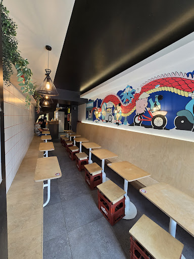 Le cadre : un long couloir épuré mais joliment décoré en mode asiat street. A l'une des extrémités : l'entrée ; de l'autre : les cuisines et le comptoir. Entre les 2, une dizaine de tables qui se font face, sans compter la petite terrasse.
