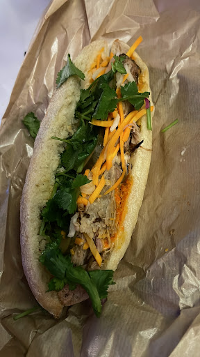 Read moreSuper revisite du Bánh Mì vietnamien on retrouve les herbes aromatiques, les légumes saumurés et le concombre ! La revisite se trouve au niveau de la baguette et de la viand, où Smokey banh mi vous proposera un pain type tradition pas trop cuit et non le fameux pain papier du Vietnam, et un porc effiloché avec une sauce caramélisée. Cela me fait penser au porc de Polynésie / Hawaii qui est cuit pendant des heures et qui s’effiloche au toucher. C’est une très belle revisite même si parfois je regrette que les légumes ne soient pas suffisamment pressés et trempent le pain le faisant perdre son croustillant (dépend de la personne qui prépare). Au delà du banh mi (le sandwich vietnamien) vous retrouvez d’autres plats souvent avec en base protéine le Smokey porc, et des plats du moments comment le sandwich poulpe ou encore crispy chicken. Petite deception néanmoins sur le bò bún, il y a un déséquilibre entre la quantité de vermicelle et la salade, l’utilisation du mesclun de jeunes pousses n’est pas un bon choix à mon avis, les nems sont assez vides et le porc n’est pas toujours bien déchiré on retrouve parfois de gros morceaux par ailleurs je pense qu’un bœuf émincé au sesame ou à l’oignon serait plus approprié. Le nuoc mam est bien équilibré, le piment manque de force. La revisite n’est pas au rendez vous. Je recommande tout de même à 100% pour les personnes souhaitant redécouvrir le sandwich. Le temps d’attente est peu long...