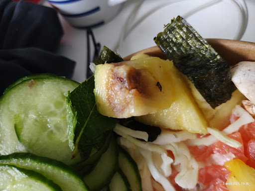 Je n'ai pas de photos, dommage, mais vu le prix du poke bowl pour du riz et des légumes, on s'attend quand même à des portions minimales au niveau des ingrédients, surtout quand on en choisit très peu (moins de 5 au total!) histoire de rentabiliser le tout. Mais là j'ai cru halluciner en voyant 4 MINUSCULES morceaux d'oignons rouges de même pas 1cm chacun. Ce n'est pourtant pas ce qui coûte le plus cher... Ils ne prennent plus les ingrédients avec les mains mais du bout des doigts.