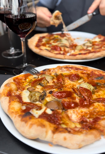 Une pâte à la fois craquante et onctueuse en bouche, des condiments premiums composent la garniture et chaque bouchée devient une invitation à prendre son temps à la dégustation… C’est simple, nous avons déjeuné dans un silence monacal tellement, les saveurs étaient inhabituelles comparées aux pizzas de la concurrence. Oh… excellent vin 🍷⭐️