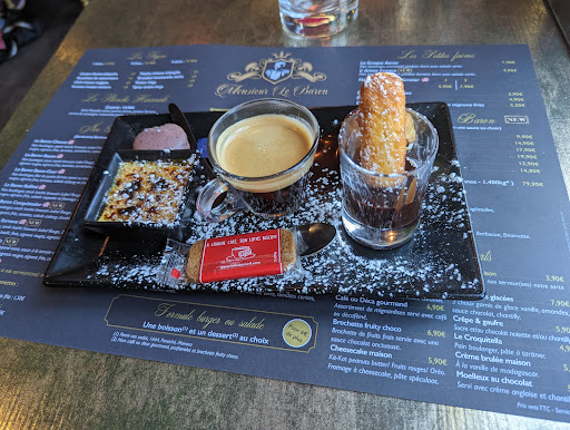 Read moreFin avril, mon épouse et moi avons fait une petite escale à Limoges sur la route des vacances. Le soir venu, nous nous sommes mis en quête d'un établissement où diner. Mais après avoir fait le tour de plusieurs quartiers, nous n'avions toujours pas trouvé notre bonheur. Dépités, nous rentrions vers la gare quand avons croisé "Monsieur le Baron". D'extérieur, on aurait plutôt dit un bar à cocktails chics, mais la carte nous a mis l'eau à la bouche. Le personnel est accueillant et aux petits soins, la nourriture excellente (je conseille le Baron Conquistador et sa petite sauce relevé, et le Duc New Yorkais, un hot dog copieusement revisité). Les desserts ne sont pas en reste ! Le tout dans une ambiance très feutrée, mais avec des touches humoristiques. Bref, en couple, entre amis ou en famille, c'est l'endroit idéal pour passer un bon moment si vous êtes à Limoges, et pour un rapport qualité/prix tout à fait honorable. Encore bravo à l'équipe de Monsieur le Baron, qui nous a permis de bien commencer...