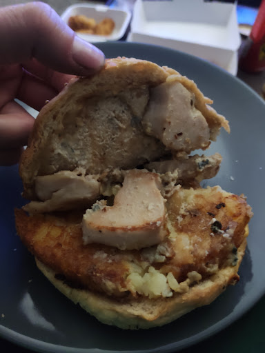 Le burger Chicken Savoyard que j'avais commandé était loin de correspondre à sa description. Selon le menu, il aurait dû contenir des rostis, du bacon, du fromage à raclette, des oignons caramélisés, des lamelles de poulet, de la salade iceberg et de la sauce fromagère. Cependant, plusieurs éléments essentiels étaient manquants : le bacon, le fromage à raclette, les oignons et la salade. Au lieu de cela, le burger était garni de cheddar et de bleu, qui n'étaient pas spécifiés sur le menu. Étant donné que je n'apprécie pas ce type de fromage, je n'ai pas pu consommer le burger.