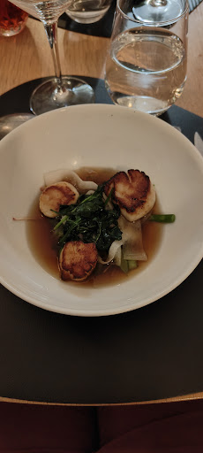 🍲Deuxième entrée : bouillon thaï (lait de coco, citronnelle, gingembre), huile de persil, piment d’Espelette, gambas, Saint-Jacques, maquereau. C’était vraiment bon, le bouillon avait du peps, avec des marqueurs bien poussés, mais pour nous le maquereau était trop peu cuit puisqu’après un rapide passage à la salamandre, c’est le bouillon qui faisait sa cuisson.