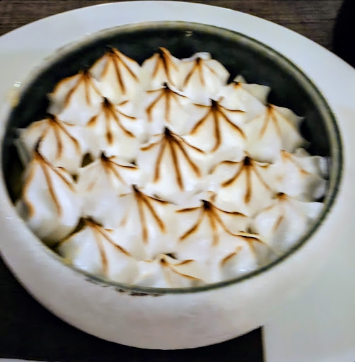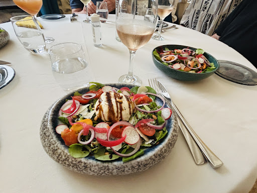 The table d'hôte meal four of us chose was amazing and reasonably priced for such an outstanding meal. For entrées, the choices were filet de merlu (a filet of hake) with vegetables (asparagus, peas, carrots, broccoli, potatoes) in a sauce that the menu described as "crustacean" sauce — made from the reduction of shells of seafood like shrimp and crab; or chicken pieces cooked in a sauce that Karin, who chose it, called Moroccan, with coriander and cumin and ground peanuts. For salads, there was burrata with freshly made pesto and salad greens, a tapas platter, or a seafood salad. Among ourselves, we chose all three. With these items came a glass of wine. Some of us chose a local rosé and others a local white wine.
