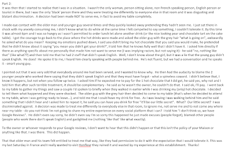 Payer plus de 35 euros le brunch pour que la serveuse se trompe de table, pose notre assiette sur la table dâĂ cĂŽtĂ©, que lâenfant de la table dâĂ cĂŽtĂ© mette ses doigts (sales) dedans, et quâensuite, en se rendant compte de son erreur, la serveuse a simplement repris le plat Ă lâenfant et nous lâa reposĂ© Ă nousâŠ.(lâenfant avait mouillĂ© le pain car il sâĂ©tait lĂ©chĂ© les mains avant de toucher) Câest trĂšs moyen ! Elle a fait une erreur et aurait dĂ» retourner en cuisine pour nous refaire une assiette (ou au moins faire semblantâŠ.) mais lĂ , le professionnalisme nây Ă©tait pas.. au vu du prix payĂ© et du cadre du lieu qui se veut chic, câest dommage.