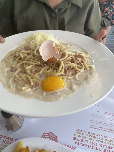 On nous sert Un plat dâescalope de poulet avec des morceaux bouillit infĂąme absolument pas cuisinĂ© au bout de 50 minutes Au moment de nous servir aprĂšs 55 minutes, la serveuse nous sert un plat de pĂątes carbonara avec une coquille dâĆuf dessus (photo). La serveuse nous rĂ©torque quâon est « chiant » que câest juste une coquille dâĆuf dans le plat (vive les bactĂ©ries) sachant que nous avions une personne malade avec nous.