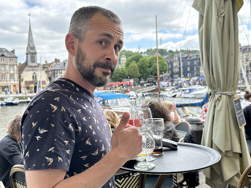First day in Honfleur, nice walk around and found this little place on the Marina... I asked the waiter if they had cider, and he replied "of course Sir, this is Normandy." Never offered us a menu, and asked us to take a seat... 2 small bottles of cider appeared, which I must say were very nice. We asked for water for our dog, and had to ask twice more before was finally bought one.... Service not great, the guy who served us was too busy having a beer.... Then I picked up the bill... €32. I felt a little foolish for not asking for a menu, but nor was I offered one... typical tourist rip off, had bought us the most expensive one the sold..... lesson learnt, paid the bill and won't return. Make your own mind up as whether this was a nice/fair...