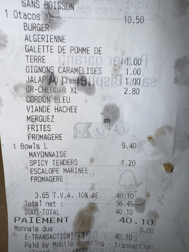 La première impression est en plus très bonne puisque la salle du restaurant est spacieuse, bien décorée et très fonctionnelle avec de nombreuses prises et des rechargeurs à induction sur quelques tables. Par rapport à d'autres O'Tacos, cela fait quand même plaisir de pouvoir s'asseoir passé 19h07. Victime de son succès, ce O'Tacos nous fait un petit peu attendre mais cela reste correct. On peut encore appeler cela un fast-food. Et l'accueil est sympathique en caisse, tout roule donc jusque ici. Mais malheureusement, le tout se gâte au niveau des tacos qui sont tout de même la raison pour laquelle on franchit le pallier de cette enseigne. Ils sont très bons, là n'est pas le problème. Mais le calibrage des tacos n'est pour le moment pas maîtrisé. À taille similaire, ils sont loins d'êtres aussi copieux que dans les autres restaurants de la chaîne. Étant un grand fan de l'enseigne et avec la confirmation de plusieurs de mes amis, je peux vous assurer que les tacos servis à Lisieux ne sont pas aussi généreux que d'habitude. On a un peu l'impression de manger l'équivalent d'un panini chez Croissantimo avec un tacos XL... On ne retrouve pas aussi le bruit légendaire lorsqu'on tapote son tacos avant de le déguster. Enfin, la galette ne tient pas tout à fait en place comme il faut. C'est donc surtout gênant sur la fin lorsque tout part dans tous les sens. Bien entendu, ces éléments sont liés à l'ouverture récente mais ils restent tout de même problématiques.