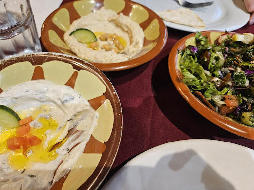 Packed and Busy at Dinner. Works if Not in a Rush. Not great for dinner with small kids. The main staff lady was very accommodating and welcoming when we showed up without a reservation. However, we probably should not have stayed - it was packed inside and the tables were very close together. It took a while to take our order and then even longer to get our food. Our 9-month old son was just unable to deal with the long wait and how overstimulated he was by everyone walking around and the tables around us. We ordered the 8 mezeh plates for 2 special. The 4 cold courses were okay - three dips (humus, tzatziki and baba ganoush). The pita was nothing special and the dips were honestly a bit bland. We were almost an hour in at this point, so we asked to take the 4 hot plates to go, and again the main staff lady was very understanding and went to see it right away. There was a little bit of miscommunication because a few mins later another staff member brought out two of our hot plates (and I asked again for takeaway, to which I got a little bit of attitude). We quickly paid, waited for our food and left. We ate the hot plates back at the hotel. They were good even cold (particularly the chicken wings, which were very flavorful). Would have been a better experience if we weren't pressed for time. Probably would only do one or two cold plates and more of the hot plates as well (instead of the 8 mezeh plates...