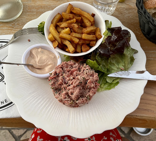 (2 of us for dinner on Wednesday in March). Highly recommend. Walked in without reservations. Place was busy, so we were happy to be seated right away. Service was attentive and friendly. Food is amazing, some of the best we've had in France over 2 weeks. Good fish bread with olives for the amuse bouche. Green veggie soup for me, delectable bone marrow for my friend; second best bone marrow I've tasted on the planet. I got the fish for main plate, my friend the epic-size steak n frites which comes out on a enormous cutting board. Desserts were probably the best we've had in France: Paris-best & Mille-Feuille d'Arlette. So so divine. Kir Royal great, but the bottle of Cabernet Franc that was recommended, oh my goodness, incredible. So incredible, I bought another bottle to take home with me. It was Saumur Champigny from Lydie et Thierry Chancelle 2020 (fruity and more heavy...