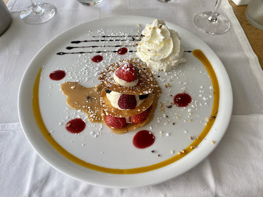 Concernant la table, les 2 verres étaient sales, nous avons dû demander de les changer. Nous avons commencé avec un cocktail de fruit frais à 6,5€ qui était franchement pas terrible. Puis, 2 menus a 29€ avec : En entrée une salade de cabecou toasté. Le pain était mou et le fromage froid à des endroits et chaud à d’autres. Une soupe de poisson qui était très bonne avec une rouille, du fromage et croûtons maison. En plat, une souris d’agneau rôtie balsamique et cacahuète grillée qui demande un supplément de 2,5€. La cuisson était bonne, le tout agrémenté de pomme de terre et légumes. Et une daurade grillée, sauce vierge qui était un peu trop cuite et le riz était noyé dans la sauce. En dessert, une crêpe tournesol noyé dans sa sauce au Grand Marnier et une tarte tatin avec sa glace vanille.