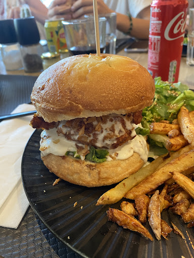 Read moreLaatste dag van onze vakantie hier onverwachts nog gaan eten. Hoewel het nog geen hoogseizoen was en ook gewoon een doordeweekse dag, waren wij nog net op tijd om met z'n 2en een tafel te bemachtigen. Dus reserveren is waarschijnlijk wel slim. Wij hebben gekozen voor het menu met een hambuger van de dag. Deze was met spek, ui, Rucolasla en Emmenthaler kaas. Daarbij een flinke portie frites, kleine salade en een (fris)drankje naar keuze. De keuze is echter iets uitgebreider, maar niet heel extreem groot. Het ligt er maar net aan waar je trek in hebt en hoeveel trek je hebt. Onze bediening was uitermate vriendelijk, sprak ook redelijk goed engels, hoewel wij wel een klein beetje frans kunnen verstaan en spreken. Na de bestelling was onze maaltijd vlot op tafel en de porties zijn meer dan okay. Wij gingen in ieder geval voldaan weer huiswaarts. Prima tentje en goed eten. De sfeer is iets minder, het terras ligt n.l. direct aan de rotonde en doorgaande weg naar Vigan. Wij hebben binnen gegeten, het zag er op zich netjes uit, maar niet bijzonder. Geen gebruik gemaakt van de hygienische ruimte, dus daar kan ik niet over oordelen.Maar zeker de moeite waard wanneer je snel even een warme hap...