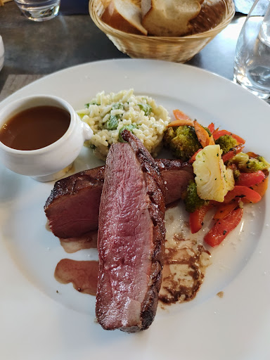 We turned up without a reservation and very little French. We were made welcome by helpful staff at a busy time. The food was first class and cooked to perfection. Being a funny British person I asked for my steak to be well cooked, the outside was slightly charred in parts just as I like it the inside was juicy and tender, the sauce was superb. The other meal was trout and reportedly of an equally high standard. If you are passing this way donât miss the opportunity to dine here, if you are not passing make a special trip! Other reviewers mention the views from the balcony but rain was forecast on the evening we ate here so sadly it was not in use, although I doubt I would have noticed the view once the food...