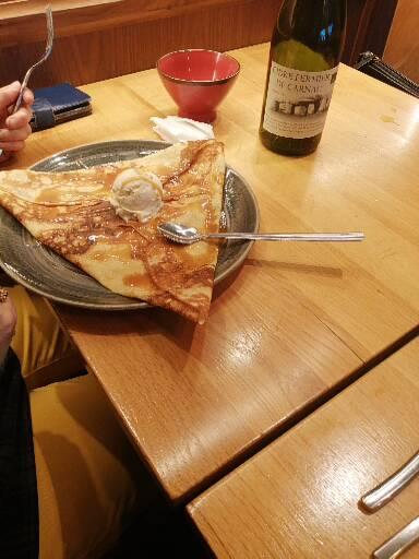 Read moreNous nous sommes arrêtés en début d'après-midi avec ma compagne et nos 2 enfants, pour simplement 1 crêpe sucrée et une boisson chacun (petit déjeuner tardif). La carte est relativement variée mais les prix ont semblé élevés dès le premier coup d'oeil (12,60€ la crêpe suggestion du jour avec des fraises, de la glace vanille et de la chantilly...). Après en avoir eu assez de poireauter pendant presque 10 min à attendre que quelqu'un vienne nous voir (les serveuses sont pourtant passées plusieurs fois à côté de nous), nous nous sommes décidés à aller demander s'il était possible de s'installer à 4 personnes. Déjà l'accueil nous a semblé tout de suite glacial, c'est peu de le dire. Ensuite quand nous avons dit que nous voulons seulement une crêpe et une boisson, la serveuse a immédiatement fait une tête d'enterrement. Que dire de la suite... Le point positif est que nous avons été servis rapidement. Mais pour le reste... Un service déplorable, aucune forme de politesse ni d'amabilité de la part d'aucune des 3 serveuses que nous avons clairement eu l'impression de vraiment déranger. Les 3 serveuses extrêmement mal aimables. Quant aux crêpes, la garniture était correcte mais les crêpes avaient dû être faites tôt le matin voire même la veille car elles étaient très sèches et donc très très chères pour ce qu'elles étaient. Comme l'a dit une autre personne, cette crêperie est une arnaque, le prototype même de l'attrape touristes. Et pour couronner le tout, la "serveuse" a envoyé ch... Ma compagne qui voulait payer une partie de la (chère) addition en tickets resto, ce qui est impossible dans cette crêperie. 54,90€ pour 4 crêpes et 4 boissons, avec un service déplorable, à vous de voir... Nous n'y reviendrons pas,...