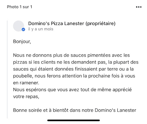 Je réponds ici à votre commentaire car je ne peux pas y répondre autrement : Alors oui ma collègue vous a appelé en amont dans la semaine, mais non à AUCUN moment vous ne lui avez parlé des tarifs, ni des frais de livraison !! Elle a su juste au dernier moment le montant global de la commande lorsqu'elle a rappelé votre collègue le jour J et là encore il ne lui a jamais dit qu il y avait des frais PAR PIZZA!! Sinon on aurait jamais commandé avec vous ! De plus, concernant le geste commercial, c'est vous qui lui aviez dit spontanément que si on avait une grosse commande vous en feriez un, mais encore une fois, le jour J, votre collègue lui a dit que non il était pas au courant, donc il a proposé 2 / 3 bouteilles de soda .... (chose que vous offrez sur votre site même pour des petites commandes) et à 45€50 de livraison... on les a largement payé ! Maintenant pas de soucis, on est prévenu, plus jamais on commandera avec vous et on prévient les autres aussi! ( dommage l hôpital commande assez souvent le week-end et des...
