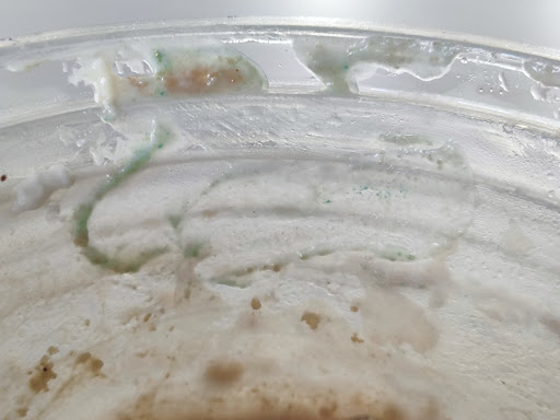 Ce jour, des proches de la famille et moi avons mangé des salades repas et des desserts, pas de soucis au niveau des salades, mais vient le moment des desserts. Il s'agissait d'un pot de crème fouettée avec du biscuit broyé et des fruits rouges sur le dessus. Je mange mon dessert et je trouve un arrière-goût très désagréable, pensant avoir consommé un fruit trop mûr ou peut être un peu moisi, je finis mon dessert (à tort) mais la sensation désagréable et l'arrière-goût acide et amère en bouche me reste encore au moment où j'écris ces lignes. Viens après moi, le dessert d'un proche de la famille, là, il grimace fortement et recrache violemment sa première cuillère (pour le faire recracher à manger, il faut y aller.), il me confirme que c'est immangeable et on regarde son dessert, dans la crème, on trouve une tache granuleuse vert fluo comme du moisi ou un produit ménager voir pire et je ne l'espère pas...