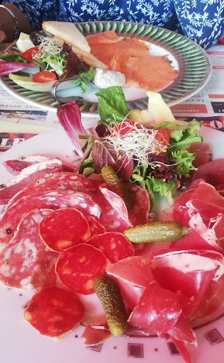 Notre choix le menu bistrot à seulement 23 € fut à la hauteur du lieu. Saumon fumé par nos soins pour Evelyne et pour moi une énorme sélection de charcuteries fines et viandes fumées maison pour votre serviteur le tout arrosé bien évidemment dun Quincy qui va bien.