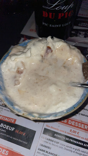 Pas de produits de la mer ni poissons pour le plat de résistance, vous vous en douter je vais pas au resto pour manger du poisson en tant que guide de pêche mais c'est la spécialité du Cargo les produits de la mer. Donc pièce du boucher grillée viande VBF pour leloupbar et Andouillette de Guéméné grillée crème moutarde pour madame avec une petite cuvée des Alpilles chateau Romania ça change du Bordeaux.