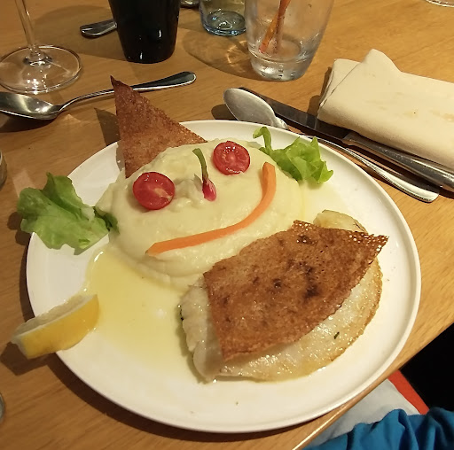 Read moreBon mais cher. Le personnel est sympathique et serviable mais à ce prix, je pense qu'on peut placer les gens autre part qu'à proximité du débarras (ou on range la salle, c'est une option aussi). La prochaine fois on demandera la salle du bas. On voulait tenter le partage de plats mais ce doit être pour toute la tablée (là c'est compliqué) et on ne peut pas choisir ce que l'on veut car c'est 3 plats différents maximum aussi pour la tablée de 6 personnes (toujours aussi compliqué !). Donc après avoir désigné des volontaires pour changer leur plat, on a pu commander. Personnellement, j'ai pris l'andouille de guemenee+ saucisse fumée. J'ai eu 4 tranches fines de chaque sur une purée maison. C'était bon mais pas du standing attendu de ce restaurant. Les autres convives ont eu l'air mieux servis (rôti de lotte qui avait l'air bon). Pour les desserts : plutôt bons mais rien d'extraordinaire. Mon fils a eu une jolie assiette. Il était content de son repas. On reviendra sûrement mais en plus...