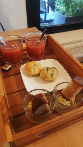 Tout d'abord je tiens à préciser que je suis venue avec ma conjointe un samedi soir, nous y avons très bien mangé pour pas chère, juste un peu déçu des petites verrines qui pour moi ressemblent plus à de la soupe froide et le poulet un tout petit peu sec mais cela reste anecdotique puisque tout le reste était ✨️délicieux✨️le houmous était exquis et le pain légèrement huilé qui allait avec l'était tout autant, le muffin d'apéritif était léger, goûtu tout simplement délicieux, en plat j'ai pris la salade qui est copieuse et franchement bonne, bien préparé et surtout bien dosé il a ce qu'il faut de tout et ma conjointe de la volaille où les PATATES étaient succulentes mais vraiment ça fait longtemps que je n'ai pas manger des PATATES aussi bonnes que ça et franchement chapeau 🎩, en dessert nous avons souvent en faible pour les panna cotta et c'était tout simplement la meilleur panna cotta qu'on a manger sur Lorient et Lanester réunis, on c'est tout simplement régaler et je tiens à précisé également qu'on est au centre de Lorient et qu'on est super bien isolé, il y a des bars juste en face et on peut manger à l'intérieur du restaurant dans le calme sans que le bruit extérieur nous dérange et ça cets un grand plus, je ne peux que vous le conseiller ce n'est pas pour rien que lorsque j'écris ce commentaire il est noté 4.9⭐️ (je me demande juste quel imbécile a pu mettre...