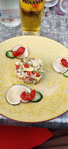 Read moreBel emplacement, au port de Saint Goustan à Auray, sur le quai Franklin, au bord de la rivière (le Loch). Il est un peu à l'écart, à côté d'une crêperie, au milieu du quai, assez "loin" de la place où la concentration des restaurants est importante - et bruyante. Vous pouvez déjeuner en terrasse - en haute saison, venez tôt avant midi, ou bien réservez - (nous étions là le 18 juillet à 11h50 et elle s'est remplie très vite !) ; une salle, plus cossue mais chaleureuse vous attend à l'intérieur au 1er étage. À ce même niveau en haut de l'escalier sur la droite sont les toilettes, deux cabines non genrées, très propres, avec un lavabo commun. Le service, agréable, décontracté et efficace, est fait par des jeunes gens (filles et garçons). Le menu du jour est à composer soi même selon son appétit (entrée+plat, plat+dessert, entrée+plat+dessert), avec deux options d'entrée autour du poisson et deux plats, l'un de poisson et l'autre de viande. Il n'y avait qu'un seul dessert. Manger à la carte est également possible, avec un choix plus large, comme souvent. Nous avons opté pour un menu complet autour du poisson pour nos entrées et plats (rillettes de maquereau et terrine de poisson, filet de julienne avec purée de carottes et petits légumes). Ce fut fort bon, juste un peu épicé comme il faut pour le plat). Pour continuer, on nous a servi une nectarine en tranches dans une sauce diplomate, parsemée de brisures de speculos. Excellente conclusion pour ce repas simple mais fin, léger, accompagné d'une eau minérale gazeuse de Plancoët (Côtes d'Armor). Les prix pratiqués (et affichés sur le trottoir du quai) sont tout à fait honnêtes. En résumé, une pause de midi...
