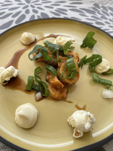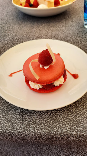 Read moreGeweldige keuken ; als aperohapje serveerden ze onder andere een zoute macaron gevuld met mousse van rode biet. Verder een tartaar van tonijn met curry popcorn en paprikablokjes. Voorgerecht waren krakend verse langoustines met gestoofde peertjes in een vanillesausje.Subliem gewoon!! Als hoofdgerecht koos ik voor een geweldig stuk tarbot met verse groentjes. Hierbij kreeg ik een romig sausje van venkel, cocos en curry....Ongelooflijk lekker en wederom vers uit de zee! Het dessert was gewoon zaligmakend; met gember en honing geconfijte pompoen met bitter chocolade ijs en mokkaroom. Met een geweldig glas champagne als aperitief en een zeer goede fles Chablis waren we net 100€ per persoon kwijt maar een ongelooflijke culinaire ervaring rijker. Belle- Ile koekt van de leuke creperietjes en restaurantjes en als eilandbewoners bieden ze allemaal verse vis aan, en er is geweldig veel natuur te zien, maar plaats Roz Avel toch maar van boven op je to do- lijstje O ja, ze hebben een geweldig terras en een grasveldje met een fantastisch tropisch ogende aanplanting . Onze viervoeter Florian was op terras welkom . Moeder en dochter zijn de gastvrouwen en...