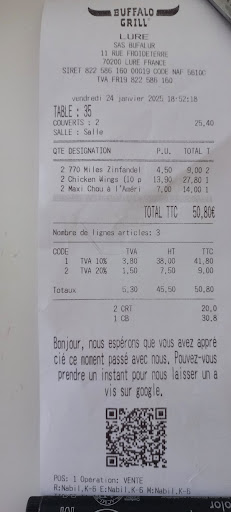 Read moreAu Buffalo đ grill. Accueil chaleureux.. On se sent trĂšs bien lĂ comme Ă la maison..une petit amuse bouche, une petite salade đ„ Bravo đ .. DĂ©licieuse viande đ„© de Bison.. Plus que tendre mĂȘme quand elle est cuite Ă point..une salle de jeu pour distraction en attendant de dĂ©jeuner, dĂźner.. Surtout nous avons Ă©tĂ© servi par Vincent, un jeune homme tout Ă fait Ă la hauteur de ses capacitĂ©s.. Un grand sens des responsabilitĂ©s, trĂšs Ă l'Ă©coute de nos demandes.. On n'a pas eu besoin de demander 2 fois.. FĂ©licitations Vincent, moi mĂȘme ds la restauration autrefois, j'apprĂ©cie sĂ©rieusement ce genre de personne.. C'est la 1Ăšre fois que Vincent nous a servi, et nous allons trĂšs vite revenir en famille.. Pour le dĂ©cor, la dĂ©licieuse cuisine, huumm un dĂ©lice toute cette nourriture aussi bien salĂ©e que sucrĂ©es, avec toutes ces saveurs, comment pourrions nous ĂȘtre déçu.. Jamais.. TrĂšs souriant đ, avenant avec la clientĂšle. Poli, correct sĂ©rieux, une valeur sĂ»re pour ce mĂ©tier, ce sont ses employeurs qui doivent ĂȘtre fiers de leur personnel. Merci beaucoup Ă toute la brigade cuisine,serveur, s erveuses.. Ă tous ceux qui font que ce restaurant fonctionne Ă merveille.. Bravo Ă tous et mille fois merci pour votre accueil, gentillesse.. Ă trĂšs bientĂŽt.Sans oublier bravo pour le parking, pour les places pour âż.. Juste une petite suggestion, fleurissez devant, c'est đ tristounet, il y a bien ce beau Chef Indien qui veille au grain sur les vitres, c'est super intelligent d'y avoir pensĂ©.. đ J'adore đ respect Chef indien..bien...