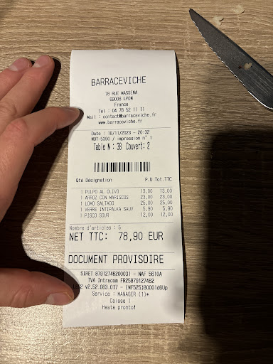 A l’occasion de l’ouverture du restaurant BARRACEVICHE, j’ai découvert une partie du secret le mieux gardé du Pérou ! Le décor, bleu ciel et bois naturel, est à la fois sobre et chaleureux. Il est complété par de magnifiques photos de portraits et de paysages de la région d’origine du Chef Sébastian. Nous sommes accueillis par Candy dont le masque ne parvient pas à dissimuler la douceur et l’authenticité de son sourire. Passons à table ! Puisse que c’est bien de cela dont il s’agit… Nous partageons en entrée des « Choritos a la chalaca », une Demi-douzaine de moules à la sauce acevichada (oignons rouges, tomates, coriandre et jus de citron vert). A chaque bouchée c’est une découverte, les parfums et les saveurs se révèlent dans une explosion de fraicheur. En plat principal, notre choix c’est porté sur le ceviche « Atún », cubes de thon frais marinés dans notre sauce Nikkei (sauce soja, huile de sésame, noix de pécans, coriandre), accompagnés de patates douces glacées, de maïs blanc à gros grain, d'avocat et de chips de banane plantain. Ici encore, c’est particulièrement fin, toutes les saveurs s’équilibrent et s’harmonisent à merveille. Les deux desserts actuellement à la carte sont délicieux, le « Suspiro de Limeña », crème à base de confiture de lait et chantilly de Guanabana au goût doux et acidulé est excellent. Quant à la « Torta de chocolate peruano », généreux moelleux au chocolat nappé de chocolat, une valeur sûre qui apportera satisfaction aux plus difficiles. Pour conclure, des produits frais travaillés avec passion par un chef talentueux, un restaurant à découvrir absolument, une équipe à rencontrer, et une carte qui va naturellement évoluée vous obligeant, ainsi, à revenir pour en apprendre un peu plus sur ce fabuleux secret le mieux gardé du Pérou ! A grand merci à toute l’équipe, nous avons passé une soirée magnifique. A...