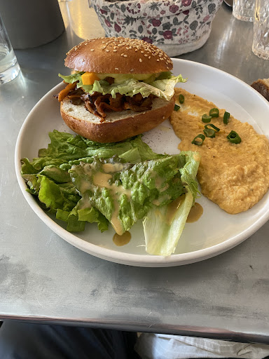 Un samedi midi une réservation pour 2. Accueil souriant dans un cadre chaleureux. La salle de restaurant est vaste bien organisée et bien agencée. Le mobilier est simple en parti de récup et installé avec goût. Le meuble du bar est très original fabriqué avec du parquet de récup ! Rien ne se perd chez Bleu Charrette ! On peut jeter un œil en cuisine un espace propre et très fonctionnel qui rassure sur l élaboration des plats proposés. Parlons en justement ! Des plats !! Installés en extérieur dans une jolie cour/terrasse à l abri des bruits de la rue l un des dirigeants vient prendre notre commande. Pas de carte longue comme le bras c est de bonne augure ! Des plats originaux fabriqués maison avec des produits locaux ! Des pâtes maison (qu on se le dise) de la kefta faite également sur place avec des saveurs magiques....une ratatouille de soleil en bouche....parlons des desserts...pour mon mari un tiramisu framboises très parfumé sucré juste comme il faut et pour moi éclair au chocolat avec une ganache à tomber parterre !!!! Et tt cela servi avec simplicité sourires et gentillesse. J oubliais le café ! Un nectar pour les connaisseurs. Adjacente au restaurant une petite épicerie ! Ramenez chez vous un peu de chez eux ! C est Félicie qui gère les conserves..sauces tomates..confitures...pickles de légumes...ratatouille...et autres trésors gustatifs tout est fait sur place !!!! Merci Augustin Félicie Clarisse Robin vous nous avez régalé de vos bons plats et de vos sourires ! Nous reviendrons pour sûr !! Et nous allons de ce pas distribuer la bonne parole de BLEU CHARRETTE autour de...